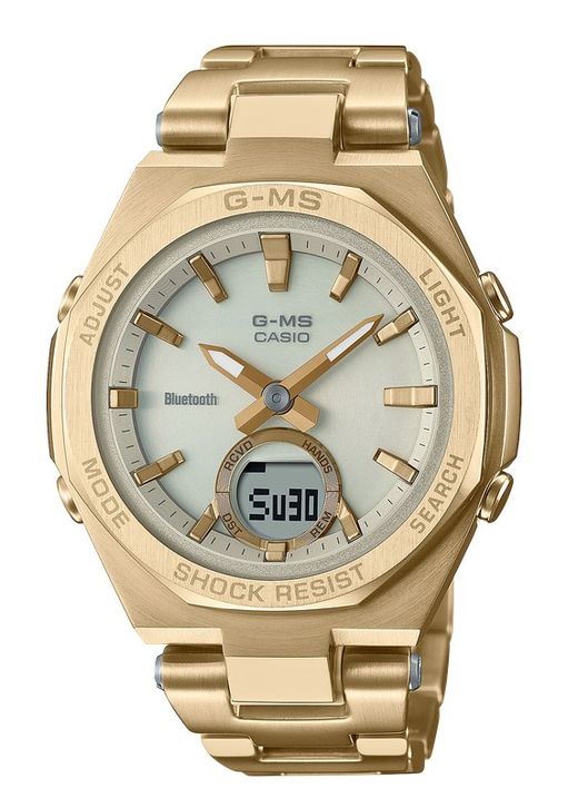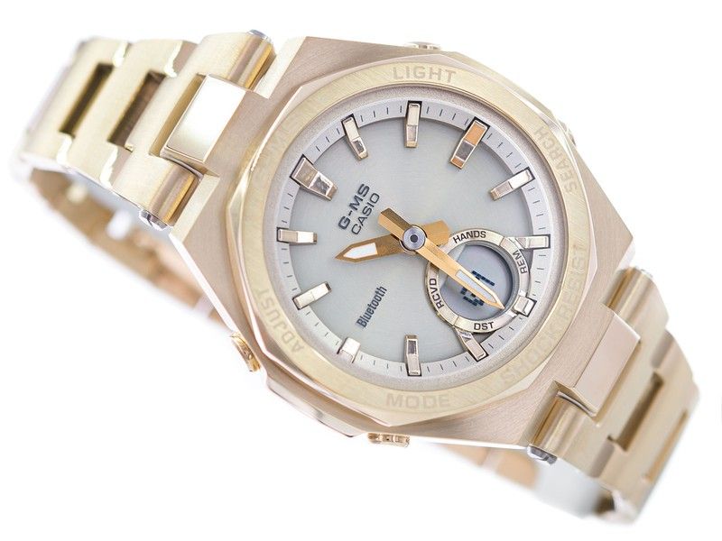 Reloj BABY-G modelo MSG-B100DG-9AER marca Casio para Mujer en color dorado fabricado con Correa de acero inoxidable con un tipo de cierre de Cierre de seguridad. Resistencia al agua de Clasificaci��n de resistencia al agua (10 bar). Es un reloj analógico-Digital de una precisión de Smartphone Link