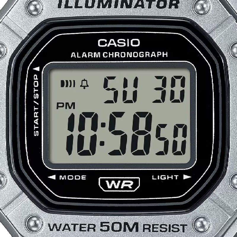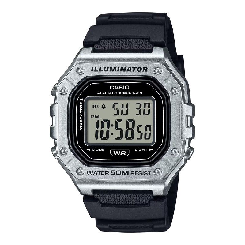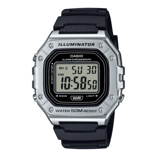 El Casio Collection W-218HM-7BVEF es un reloj para hombre con un diseño deportivo y funcional. Su caja y correa de resina, ofrecen durabilidad y comodidad, perfecto para el uso diario. Resistente al agua hasta 50 metros, es adecuado para actividades ligeras. Cuenta con funciones útiles como cronómetro, alarma diaria, calendario automático y luz LED para facilitar la lectura en cualquier condición. Con su estilo robusto y práctico, este reloj combina funcionalidad esencial y un diseño sencillo, ideal para quienes buscan unaopción asequible y confiable.